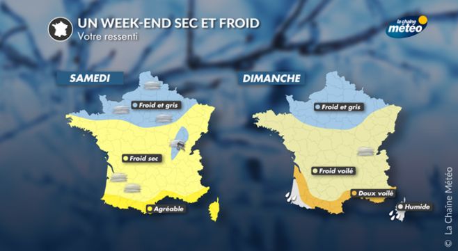 L'anticyclone résistera, mais il commencera à faiblir dans sa partie nord. Il laissera passer des nuages sans grande activité sur les régions voisines de la Manche. Dans le sud, après la dissipation des brouillards, il fera beau, mais le ciel se voilera, donnant un aspect blanchâtre l'après-midi. Le ressenti deviendra très agréable sur le sud-ouest et la Méditerranée, avec un air plus doux.