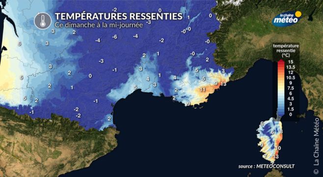 Ces vents forts accentueront le ressenti glacial. À Perpignan, Marseille ou bien Marignane et Istres, le ressenti sera proche de 0 à 4° dimanche après-midi.