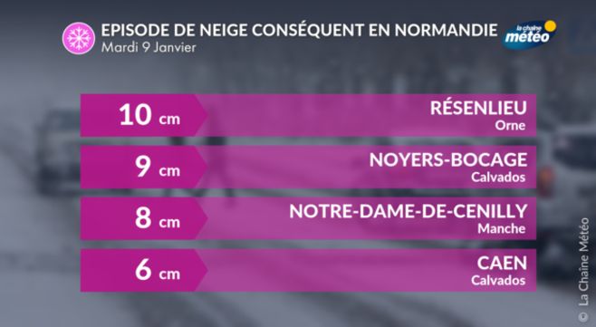 A 9h15, les chutes de neige les plus conséquentes sont observées en Normandie dans les secteurs de Saint-Lo et Vire (Manche), Flers, Falais et Argentan (Orne), ainsi que sur la partie sud du Calvados. Les hauteurs de neige atteignent en moyenne 3 à 5 cm mais localement 8-10 cm sur les collines normandes. La circulation est délicate sur les réseaux secondaires. A Caen, avec 6 cm observé au lever du jour, il faut remonter à mars 2013 pour retrouver une hauteur de neige plus importante. Il était tombé jusqu'à 25 cm le 12 mars avec du vent fort et des congères !