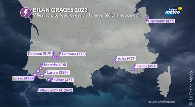 Orages 2023 : villes les plus foudroyées © La Chaîne Météo