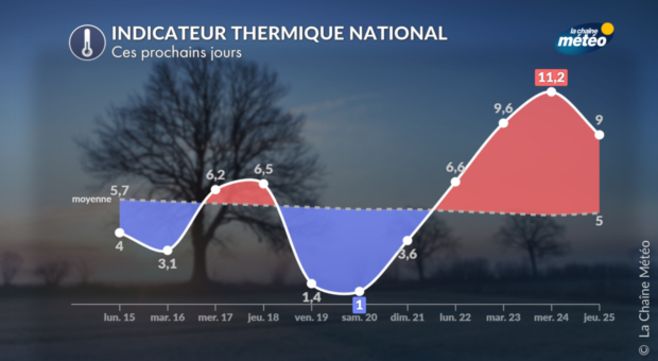 Après le pic de douceur sur les régions du sud entre mercredi et jeudi, l'air froid s'imposera. Les températures perdront 10°C en 24 heures. Cette chute de la température s'accompagnera de pluies des Pyrénées aux Alpes, et de neige à basse altitude. Au nord, le temps redeviendra pus sec, mais il fera froid. Aucun dégel n'est attendu au nord de la Seine.
