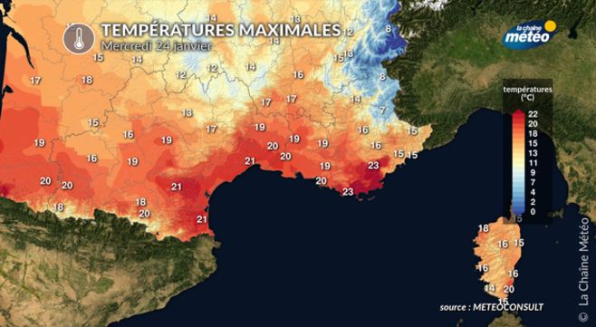 C'est mercredi, que la douceur sera la plus prononcée. Entre le Roussillon et la Provence, les températures dépasseront la barre des 20 °C. Très localement, par effet de foehn provoqué par le mistral, les températures frôleront la barre des 25 °C dans l'intérieur du Var (secteur de Draguignan) ainsi qu'à Cannes dans les Alpes-Maritimes. La tramontane produira le même effet de foehn en passant au-dessus des Pyrénées, vers la plaine du Roussillon : à l'ouest de Perpignan, entre Eus, Caixas, Vinça, Le Perthus, Le Boulou, des records de douceur pourront être mesurés pour un mois de janvier.