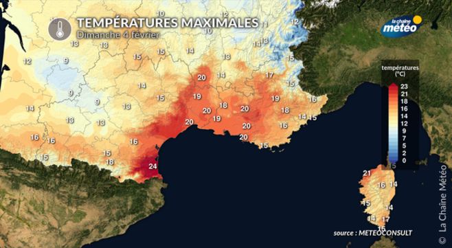 Sur les régions méditerranéennes, en remontant vers les Alpes et le Jura, vous bénéficiez d'une journée ensoleillée malgré quelques nuages bas côtiers entre l'ouest de la Corse et la côte d'Azur. Mistral et tramontane soufflent modérément. Ils font effet de foehn et accentuent la douceur avec des températures l'après-midi qui atteignent 20 à 23°C, jusqu'à 25°C en Roussillon, des valeurs d'une mi-mai, au niveau des records pour un début de mois de février.