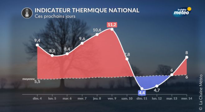 Avec le retour des pluies, les températures devraient rester très douces jusqu’à vendredi avec un indicateur thermique de +5°C supérieur aux moyennes. En cause, une dépression qui apportera avec elle un flux de sud-ouest toujours très doux.