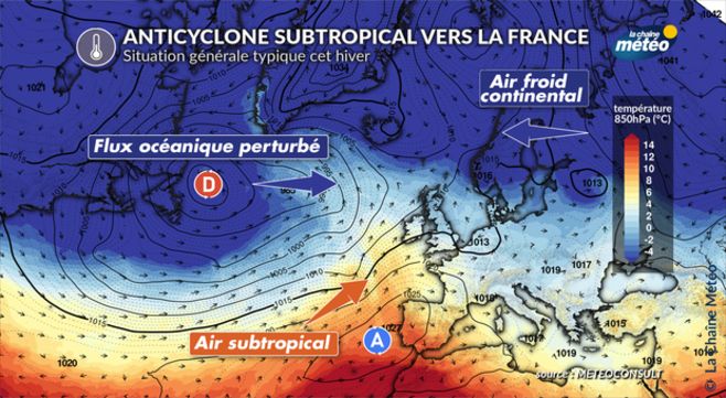 En hiver, ces anticyclones sont habituellement situés plus au sud, laissant circuler les flux d'ouest dominant sur notre pays, ce qui détermine les types de temps.