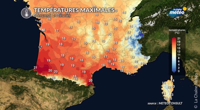 Par "effet de foehn" au pied des Pyrénées, le seuil des 25°C pourra être frôlés mercredi ou jeudi. À l'échelle nationale, jeudi sera la journée la plus douce, avec un indicateur thermique national prévu à 12,1°C (pour une moyenne de 6°C), non loin de la journée record du 24 janvier (avec 12,28°C).