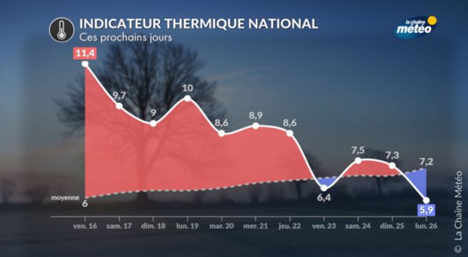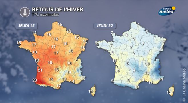 Les températures très élevées de cette fin de semaine commenceront à baisser ce week-end, mais resteront environ 3°C au-dessus des normales. Elles devraient se maintenir à ce niveau jusqu’en milieu de semaine prochaine avec un flux de sud-ouest dominant. Un changement de temps est attendu jeudi avec l’arrivée d’une perturbation active et la bascule au secteur nord-ouest du vent. Les températures baisseront alors plus franchement et devraient rejoindre les normales de saison. Ainsi, en une semaine, les températures maximales auront parfois chuté de 15°C, notamment dans le sud-ouest, passant alors d’un ressenti printanier à un ressenti hivernal.