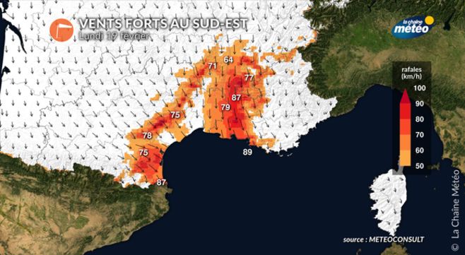 Du sud de Rhône-Alpes aux régions méditerranéennes, les éclaircies s'imposent. Le soleil en bord de mer, mais le mistral et la tramontane soufflent assez fortement, jusqu'à 80 à 90 km/h en rafales en plaine du Roussillon, moyenne vallée du Rhône et en Provence. En Corse, le soleil revient l'après-midi après une matinée grise.