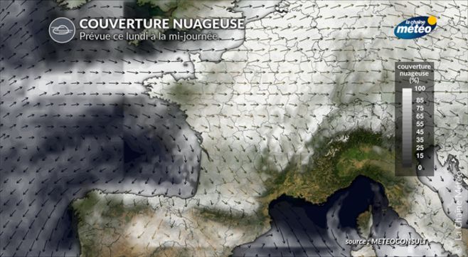 Couverture nuageuse prévue ce lundi midi © La Chaîne Météo