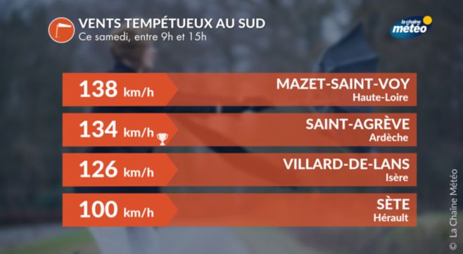 À 15 h, le vent souffle très fortement entre le Languedoc et l'est du Massif central jusqu'au Lyonnais ainsi qu'entre la Chartreuse et le Vercors avec des rafales qui dépassent les 100 km/h. En Ardèche, la tempête de vent de sud fait rage avec un record absolu de vent relevé à Saint-Agrève à 134 km/h.