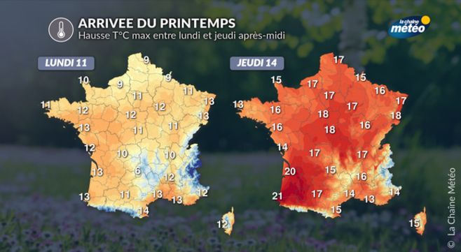 À partir de mercredi, les éclaircies devraient réussir à s’imposer par le nord-ouest. Les conditions deviendront agréables avec une hausse des températures. C’est surtout jeudi que le ressenti sera printanier avec un soleil majoritaire sur une bonne partie des régions ainsi que des températures douces : jusqu’à 18 °C sur la moitié nord, et 22 °C dans la moitié sud, avec pourquoi pas des pointes plus élevées en allant vers le pays basque, jusqu'à 23-24 °C. Le temps sera calme avec très peu de vent, vous pourrez donc profiter d'une ambiance digne d'un mois d'avril pour effectuer une escapade à l'extérieur, si vous en avez l'occasion. Ces conditions vont contraster avec ces dernières semaines humides et maussades.