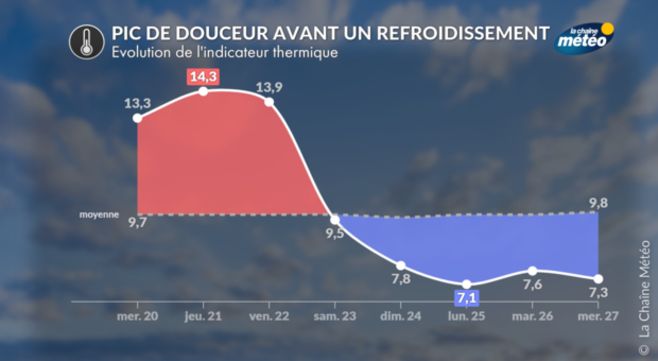 Ce vendredi sera le dernier jour de grande douceur avec un indicateur thermique prévu encore à 13,9 °C. Vous aurez, par exemple, 17 °C à Paris, 18 °C à Strasbourg, 19 °C à Dijon, 22 °C à Valence, 23 °C à Bordeaux et jusqu’à 25 °C à Toulouse.