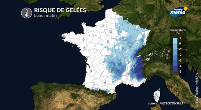 Ce qui change par rapport à hier, c'est le retour d'un temps calme et sec au nord et dans l'est et l'arrivée de pluies par le sud, annonçant un épisode d'intempéries mardi. Par ailleurs, le vent d'autan se lève et souffle à près de 100 km/h en Midi-Pyrénées le soir. Autre changement, c'est la généralisation de nombreuses gelées blanches le matin dans l'est de la France.