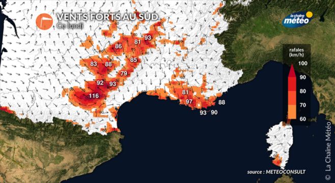 Des Pyrénées aux régions méditerranéennes en remontant vers les Cévennes ainsi qu'en Corse, après un beau début de matinée, le temps se dégrade avec un ciel qui se charge. Les pluies débutent dans l'après-midi. Prudence, car à partir de la soirée et nuit de lundi à mardi, des fortes précipitations vous concernent. Prudence également en raison du vent d'autan qui atteint plus de 100 km/h sur le sud du Massif central jusqu'au nord de Toulouse. Le vent de sud-est atteint 90 km/h sur le littoral provençal le soir.