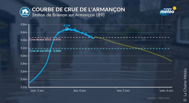 Ce mercredi à la mi-journée, les pics de crue ont tous été atteints avec des niveaux d’eau qui commençaient à baisser rapidement, notamment pour le versant de la Saône-et-Loire et le dijonnais (l’Ouche). En versant nord, c’est-à dire vers l’Ile-de-France, la situation reste plus complexe, particulièrement pour l’Armançon aval. En effet, le niveau maximal devrait passer dans la nuit de mercredi à jeudi, en dépassant le dernier pic historique de juin 2016, lors des crues majeures du bassin de la Seine qui avaient inondé la région parisienne. Le maximum historique de mai 2013 pourrait être approché.