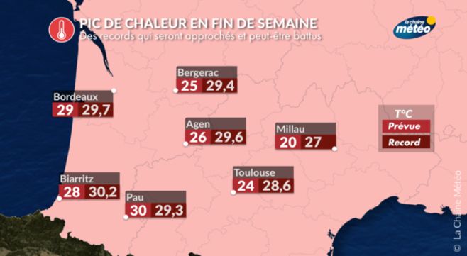 Vendredi et samedi seront deux journées remarquables pour un début avril. Quelques records de chaleur, au moins décadaires, pourraient être battus par effet de foehn au pied des Pyrénées et dans les vallées alpines.