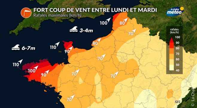 - un coup de vent balaie les côtes de la Manche et bretonnes le soir et la nuit suivante