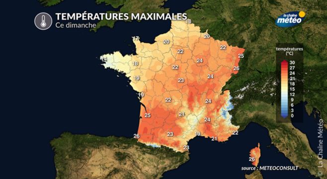 Ce qui change par rapport à dimanche, c'est la progression du temps instable et des averses parfois orageuses, excepté sur les régions s'étendant de l'Alsace au sud de Rhône-Alpes à la PACA et à la Corse qui restent à l'abri. Le temps se dégrade dans une moindre mesure en Languedoc avec quelques ondées. En Bretagne puis en Normandie, un fort coup de vent est attendu avec des rafales tempétueuses sur le Finistère. Côté températures, elles remontent provisoirement entre la Normandie et la région parisienne