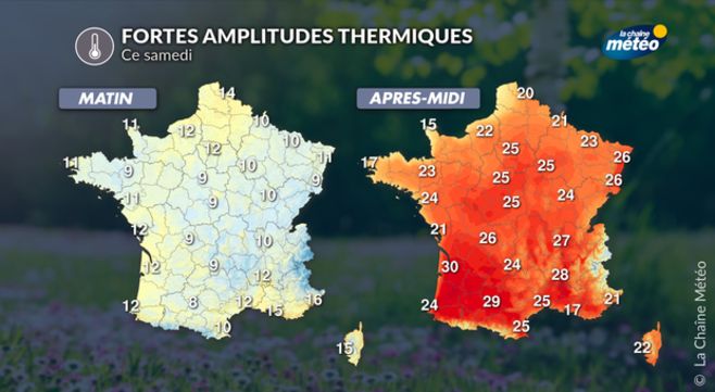 Même si la masse d’air se réchauffera très nettement en altitude ce samedi (+10 à +15°C à 1500 mètres), la nuit de vendredi à samedi très dégagée favorisera le refroidissement radiatif. En effet, l’absence de couverture nuageuse favorisera la déperdition d’énergie au niveau du sol, et donc la chute de la température nocturne. Samedi matin, on relèvera en général de 9 à 11°C sur le quart nord-est alors que les valeurs atteindront plutôt 23 à 27°C en cours d’après-midi, soit un delta de plus de 15°C dans certaines villes. Les plus fortes amplitudes seront enregistrées au sud-ouest avec, par exemple, 8°C attendu à Toulouse en matinée et 29°C dans l’après-midi.
