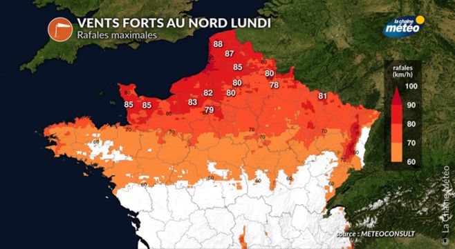 En plein vent du Nord soufflant à 90 km/h en rafales lundi après-midi, le ressenti sera proche de 5° des côtes de Manche à Lille et Calais.