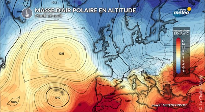 Entre lundi et mardi, les températures chuteront sur les ¾ du pays. En l’espace de 24 à 48 heures, on perdra 10 à 15°C. On repassera 1 à 3°C sous les normales de saison. Ce temps frais s’accompagnera de giboulées dans l’est, de neige des Vosges au nord des Alpes dès 1000 mètres et d’un fort vent du Nord.