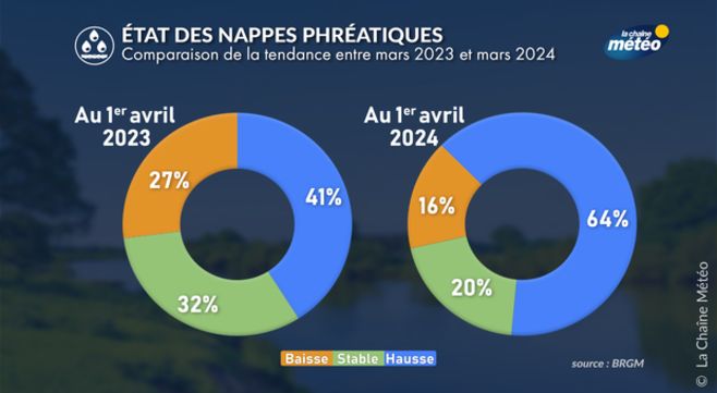 Comparaison du niveau des nappes phréatiques entre mars 2023 et 2024 © La Chaîne Météo