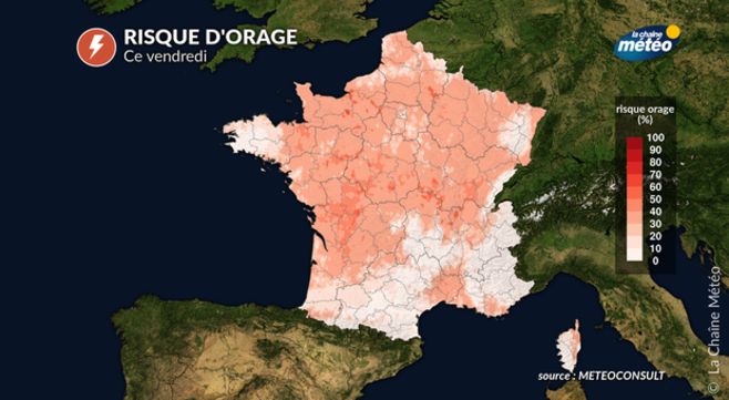 Les orages éclatent de l'Aquitaine au Val de Loire et à la Normandie. Certains touchent l'Ile-de-France vers 20h. A l'opposé, des averses orageuses tombent encore sur la PACA. Les Pyrénées et le Massif Central restent couverts. Le temps est plus calme en Alsace et sur l'arc Atlantique. Les températures restent relativement douces en raison du vent du sud.