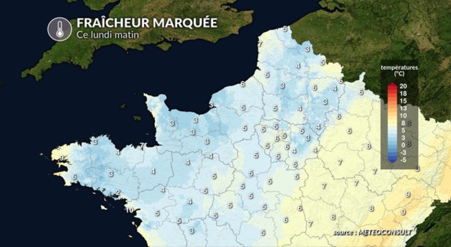 Au lever du jour, vous avez de 4°C à Rennes à 15°C à Nice en passant 5°C à Paris et Nantes, 8°C à Aurillac, 8°C à Paris, 10°C à Lyon et 13°C à Montpellier.