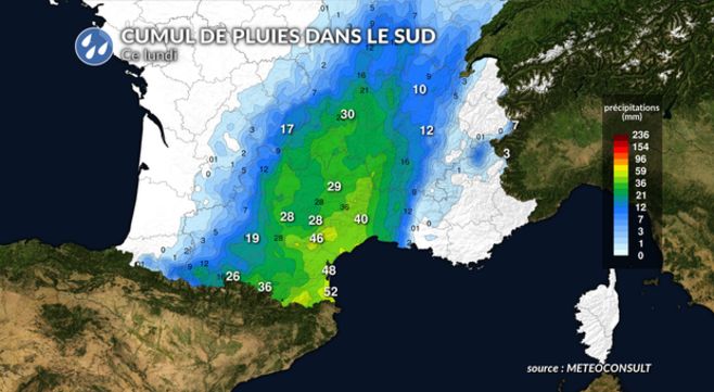 - des pluies abondantes des Pyrénées à l'Auvergne