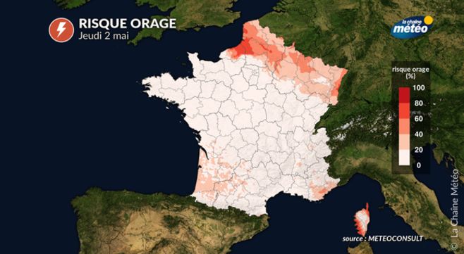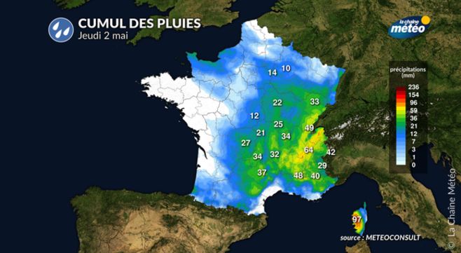 Les 2/3 pays sont sous la pluie. Les pluies sont abondantes à l'est d'une ligne Strasbourg / Montpellier. Des orages éclatent en Provence Côte d'Azur et en Corse. Partout ailleurs, même si les pluies se limitent le plus souvent à quelques gouttes ou à des averses, elles nécessitent le parapluie. De la Bretagne aux Pays de la Loire ainsi qu'en Roussillon, le temps est plus calme avec quelques éclaircies.