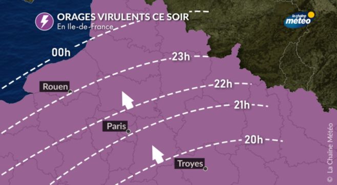 ⚠️Prudence ce soir entre 18 h et minuit sur #Paris et sa région en raison du passage de forts #orages⚡️ très pluvieux, ponctuellement accompagnés de #grêle ! pic.twitter.com/WniTf0yjxH