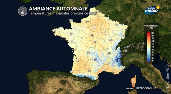 Les températures sont comprises entre 13°C à Cherbourg et 21°C à Ajaccio en passant par 15°C à Paris, Strasbourg et Toulouse et 17°C à Nice. On se situe 2 à 3°C sous les normales de saison.