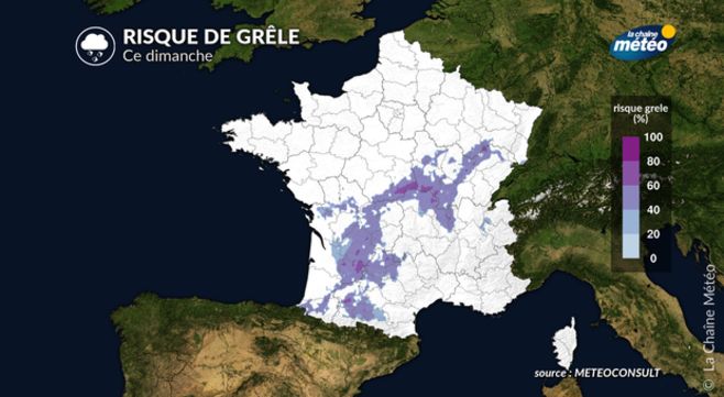 Sous les orages les plus actifs, un risque de grêle est envisagé, moins généralisé que celui de mercredi, entre le centre de l'Aquitaine, une partie de Midi-Pyrénées, le Limousin et le nord du Massif central ainsi qu'en Bourgogne. Ces chutes de grêle ne devraient pas revêtir de caractère aggravant, comme ce fut le cas lors des intempéries de mercredi soir en Bourgogne.