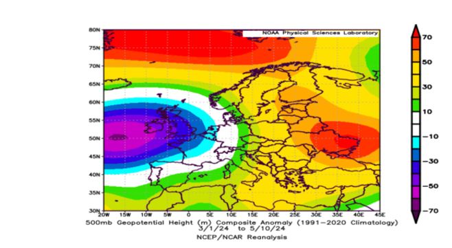 La carte ci-dessous met bien en évidence l'anomalie de basses pressions qui domlne sur le proche Atlantique depuis le début du mois de mars.