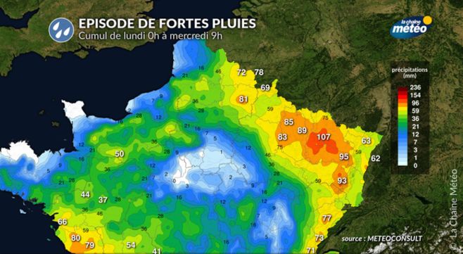 Après les fortes pluies survenues jeudi et vendredi passé où il est tombé l'équivalent d'un mois de pluie entre le Bas-Rhin et la Moselle, ce qui a entraîné des inondations et le débordement de nombreux cours d'eau, ces nouvelles intempéries sont à prendre très au sérieux. En effet, les cumuls de pluie envisagés pourraient atteindre les 100 mm, correspondant à plus d'un mois de précipitations.