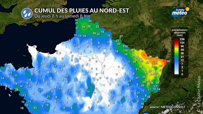 Entre jeudi et samedi de la semaine dernière, une goutte froide a traversé le nord de l'Allemagne puis le nord-est de la France, et a provoqué des pluies exceptionnelles sur le nord de l'Alsace et de la Lorraine. En 24h, des cumuls très importants pour ces régions ont été mesurés : 63 mm à Strasbourg (67), 72 mm à Haguenau (67), 84 mm à Sarreguemines (57) et jusqu'à 135 mm à Scheibenhard (67). Ces cumuls sont l'équivalent d'un mois, voire un mois et demi de pluie tombée en seulement une journée. À Scheibenhard (67), le record de pluie en 24 h a été pulvérisé (90 mm le 12 juillet 2014 lors d'un orage).
