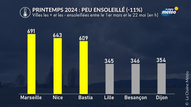 Alors que l'ensoleillement avait été proche de la normale en 2023, ce printemps 2024 a été peu ensoleillé en France avec 452 heures de soleil en moyenne nationale pour une normale de 508 heures. Le déficit est donc de 11%, les villes les moins ensoleillées en ce printemps étant Lille (345 heures), Besançon (346 heures) et Dijon (354 heures). Sur ces 3 villes du nord-est, le déficit est proche de 30% par rapport à la normale. Les villes les plus ensoleillées sont Bastia (609 heures), Nice (643 heures) et Marignane (691 heures). Ces villes proches de la Méditerranée ont un nombre d'heures de soleil proche de la normale.
