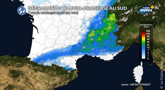 Les pluies se poursuivent des Pyrénées à Rhône-Alpes jusqu'au Jura où elles sont ponctuellement marquées et orageuses, notamment près des Cévennes. Les bords de la Méditerranée sont concernés par quelques averses, excepté la Corse. Partout ailleurs, c'est un ciel variable qui domine avec des averses près de la Manche.