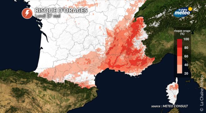 Les pluies sont soutenues en Rhône-Alpes jusque dans l'arrière-pays provençal, parfois orageuses. Sur les Pyrénées-Orientales et les bords de la Méditerranée, les averses orageuses du début de soirée laissent la place à un temps plus sec, mais venté avec la levée du mistral et de la tramontane. Partout ailleurs, les éclaircies ont tendance à se multiplier dans un air relativement frais.