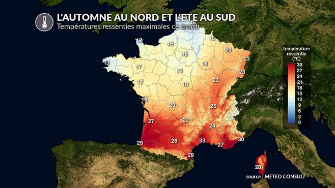 Le secteur chaud d’une perturbation envahit toute la moitié nord pour ce deuxième jour de la semaine, avec un temps souvent couvert. Des pluies tombent même près des côtes de la Manche, notamment de la Normandie aux Hauts-de-France. Ce temps couvert associé à la pluie et au vent contribuent à un ressenti très automnal au nord de la Loire. Les températures maximales attendues varient de 14 à 20°C des Hauts-de-France à l'Alsace. La température ressentie ne dépasse pas 11°C à Brest, 12°C à Cherbourg, et 16°C à Paris. En revanche vous avez plus de chance avec tout de même 23°C de ressenti en Alsace, région épargnée par cette dégradation.