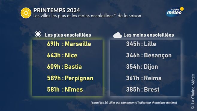 Avec les perturbations et le temps instable qui ont fait la une de ce printemps 2024, le soleil n'a pas été à la fête avec un déficit de l'ordre de 14% sur l'ensemble du printemps. Mai a été le mois le plus déficitaire en ensoleillement avec -22% de soleil en moyenne sur la France. Les villes les moins ensoleillées de ce printemps 2024 sont Lille (345h), Besançon (346h), Dijon (354h), Reims (367 h) et Brest (385h). Les villes les plus déficitaires en ensoleillement sont Dijon (+30%) et Besançon (-28%).