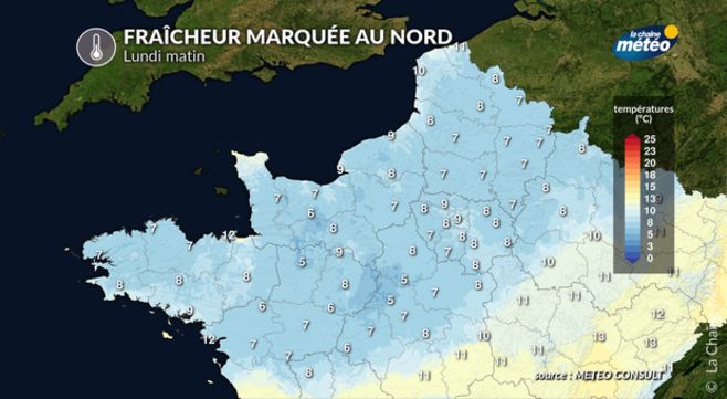 Il fait frais au lever du jour. Les températures évoluent de 6 à 12°C de la Normandie à Midi-Pyrénées, jusqu'à 16°C au bord de la Méditerranée.