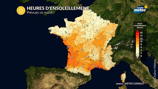 Durée d'ensoleillement prévue ce mardi © La chaine Météo