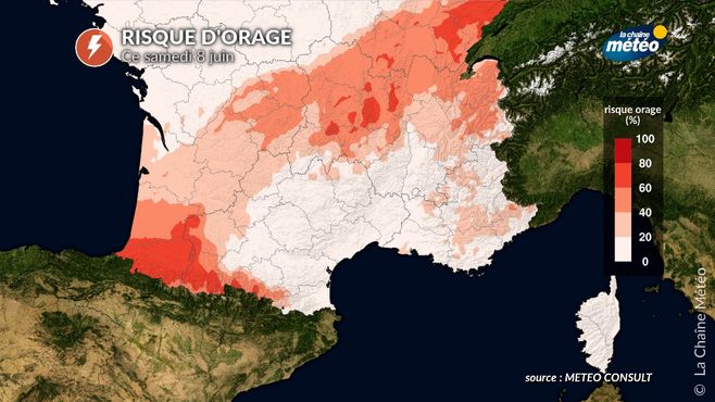 Les orages seront violents au sud-ouest dans la nuit de samedi à dimanche. Dimanche, ils envahiront le tiers sud-est, de la Côte d'Azur aux Alpes et au Jura. Le beau temps persistera au nord-ouest.