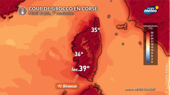 Le coup de chalumeau est attendu sur l'île de Beauté ce mardi. Si globalement les températures devraient se situer entre 30 et 35°C, dans les vallées corses près d'Ajaccio, le Sirocco pourrait faire grimper les températures jusqu'à 38-39°C voire, très localement 40°C. En Sardaigne, le coup de chaud sera plus intense avec même des pointes à 42 voire 43°C.