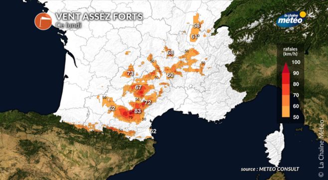 La situation évolue. Les pluies sont remplacées par des averses qui prennent un caractère orageux dans le nord du pays. Quelques orages ponctuellement forts éclatent sur le Massif central, la Bourgogne et les Vosges en milieu d'après-midi avec un risque de grêle. Des ondées concernent les Cévennes. Le soleil s'impose entre le sud-ouest, le Jura, les Alpes et la Provence Côte d'Azur. Le vent marin et l'autan sont sensibles, soufflant autour de 70 km/h en rafales.