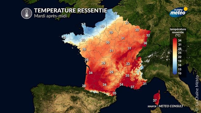 De l'air très chaud remonte actuellement sur la Méditerranée et l'Europe centrale, en limite du flanc est du pays. Les températures maximales sont souvent comprises entre 25 et 30°C entre le sud-est et l'Alsace. Près de la Méditerranée et en Corse, le Sirocco fait flamber le thermomètre ce mardi avec jusqu'à 38°C localement sur lîle de Beauté, et 34°C pour Marseille. Le ressenti reste estival également dans le sud-ouest, avant le passage des orages.