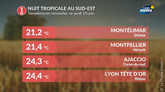 A 6 h, des monocellules orageuses concernent la Lorraine avec localement des impacts de foudre. Dans le sud-est, c'est un noyau pluvio-orageux qui remontent sur le Languedoc-Roussillon avec des intensités de pluies parfois modérées à fortes, jusqu'à 20 à 30 mm/h. Il fait lourd avec une nuit tropicale (>20°C) dans la vallée du Rhône et le sud-est.