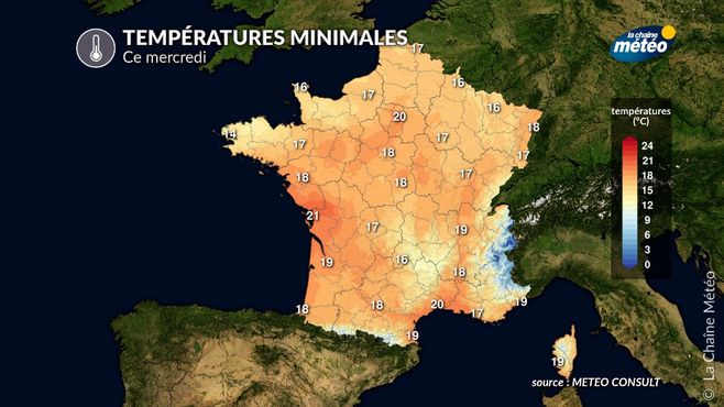 À l'échelle nationale, c'est la nuit de mercredi à jeudi qui s'annonce la plus douce et donc la plus tropicale. Dans la vallée de la Garonne, pas moins de 20 à 22°C sont attendus au plus bas jeudi matin. Il faudra se réfugier le long de la Manche pour trouver un peu de fraîcheur nocturne, puisque les températures minimales attendues jeudi matin sont de 14°C à Brest ou encore 15°C à Cherbourg.