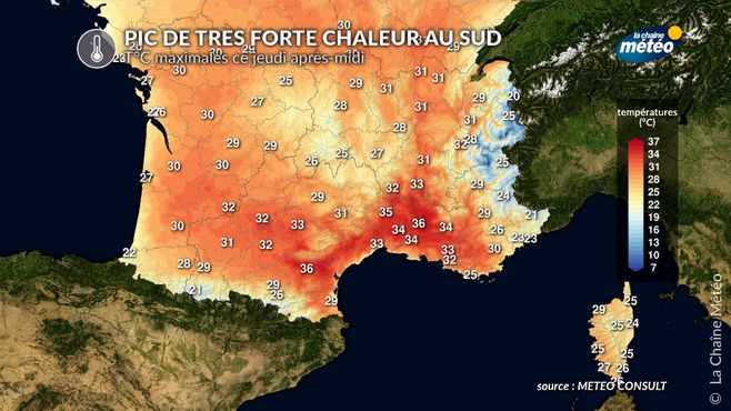 La situation évoluera peu après une nuit souvent tropicale (températures minimales > 20°C) de la vallée de la Garonne aux rivages de la Méditerranée. Les très fortes chaleurs auront quand même tendance à s’étendre vers l’intérieur provençal. Le thermomètre pourra atteindre encore 35 à 37°C en Haute-Garonne, Aude et Tarn, mais également du sud de la Drome à l’Aveyron et dans l’intérieur des Bouches-du-Rhône et du Var.